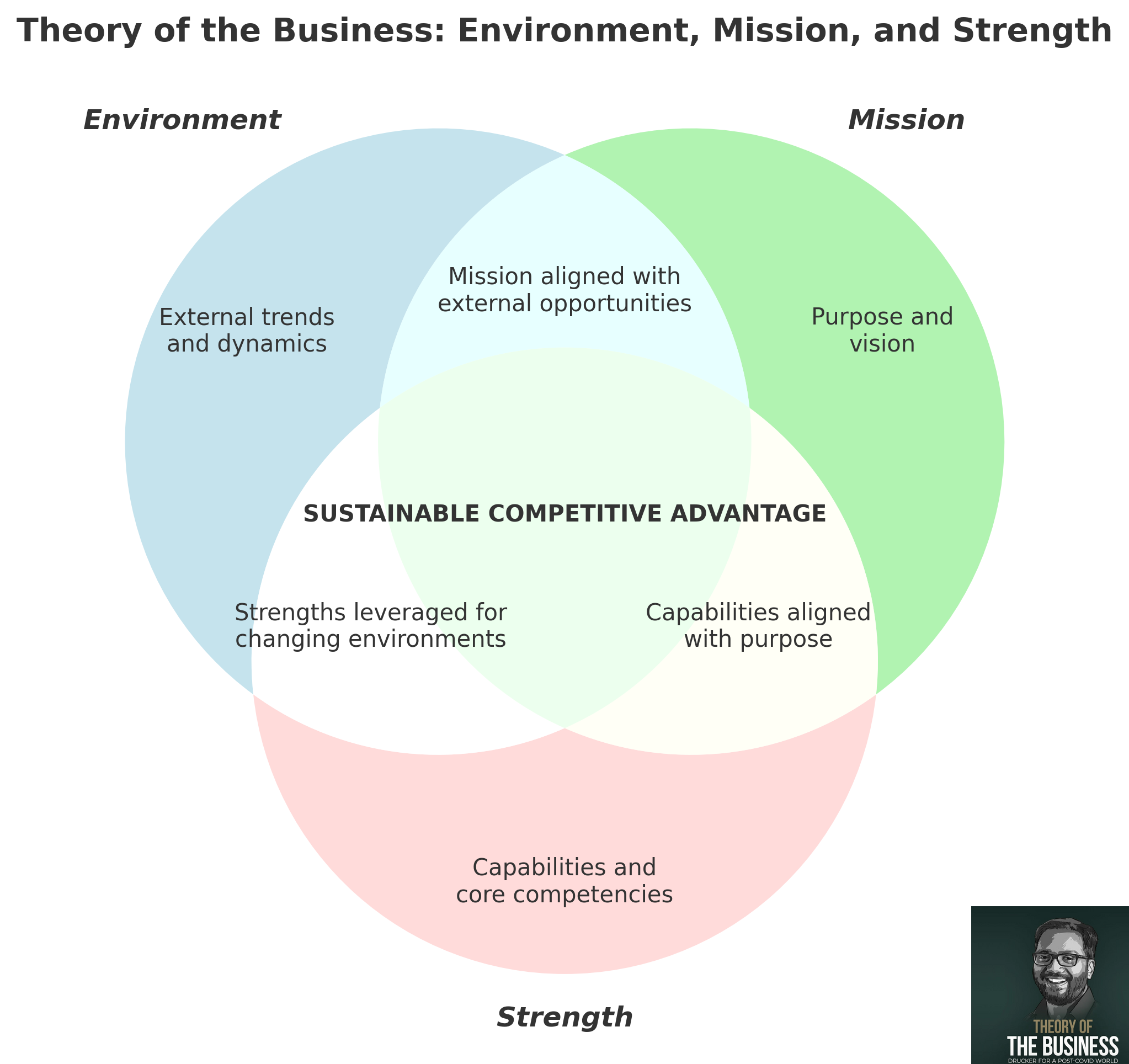 Peter Drucker’s Theory of the Business offers a powerful framework to uncover and validate assumptions. It consists of three interconnected circles: