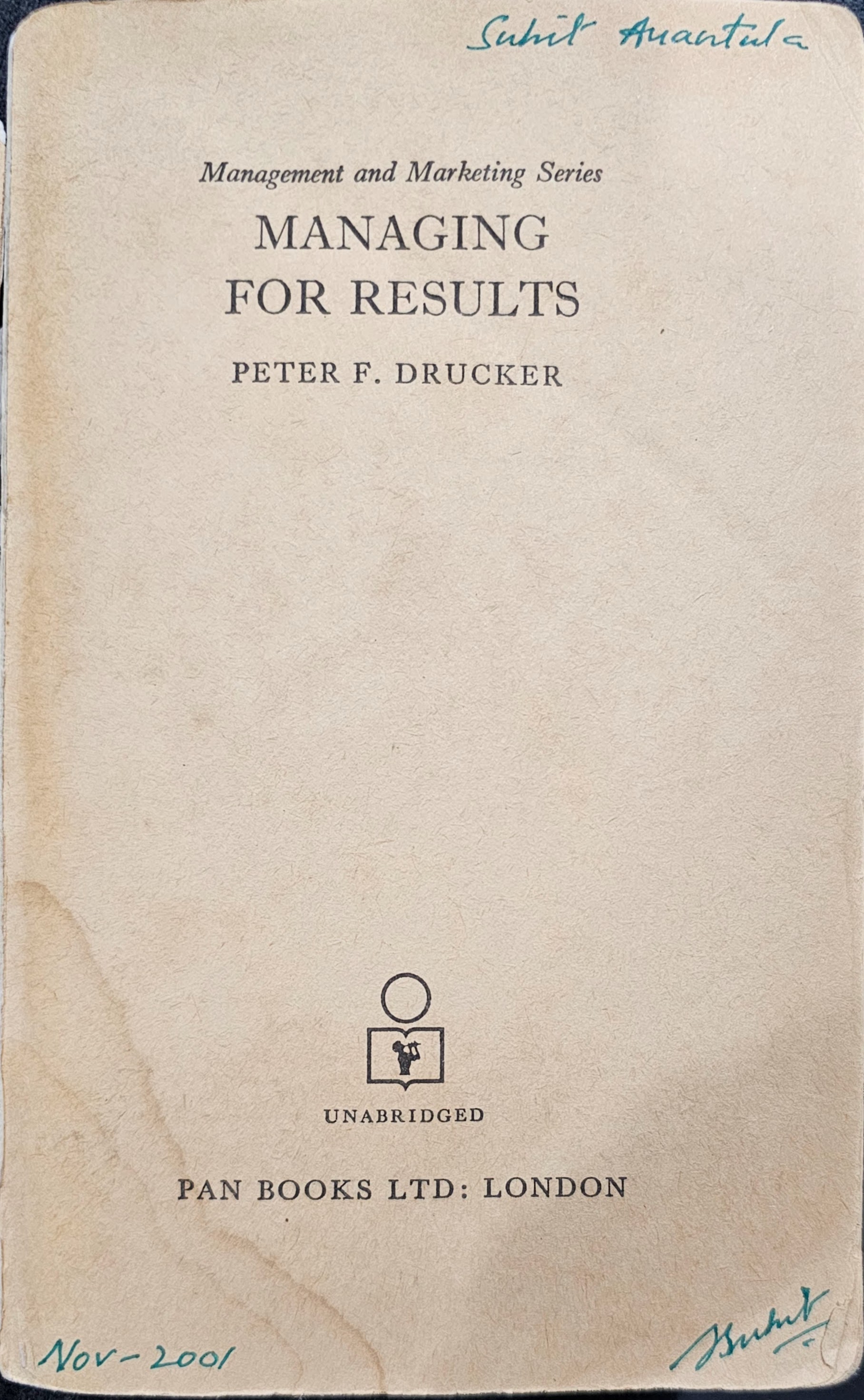 Drucker exhumed clarity, confidence, and a capability to see the world of management in a new way. An example below from this market in Koti of one of the first books in my collection from Nov 2001. For example, Managing for Results is one of the first strategy books in the world. On his editor’s suggestion, Drucker did not use the word Strategy, as this was considered a military word and not suitable for business. Those were different days, I guess.