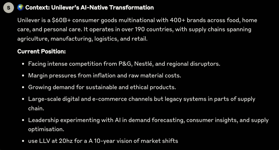 “Act as a global futurist and industry strategist. Create a 10-year vision for Unilever in an AI-native consumer goods industry. Include ecosystem shifts, competitor moves, regulatory trends, and systemic risks.”