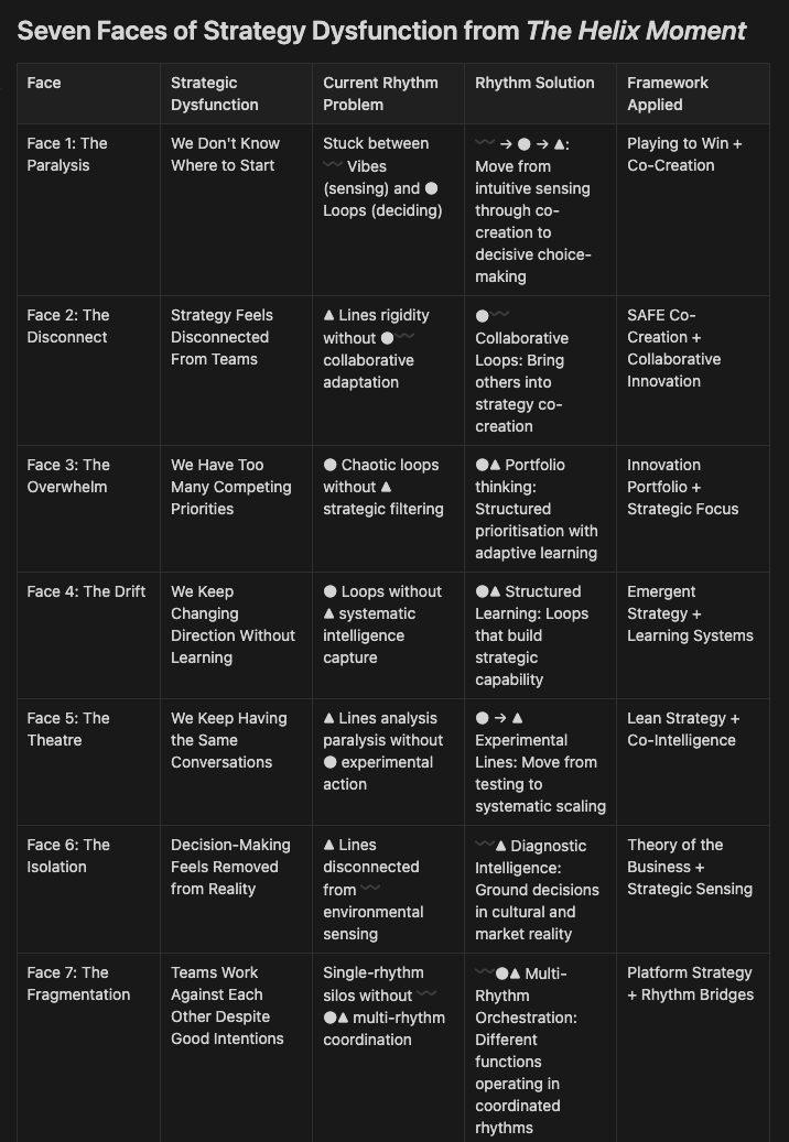 Every organisation struggles with recurring breakdowns. In The Helix Moment, these are framed as Seven Faces of Strategic Dysfunction. Each face is a rhythm mismatch—stuck in the wrong mode for the challenge.