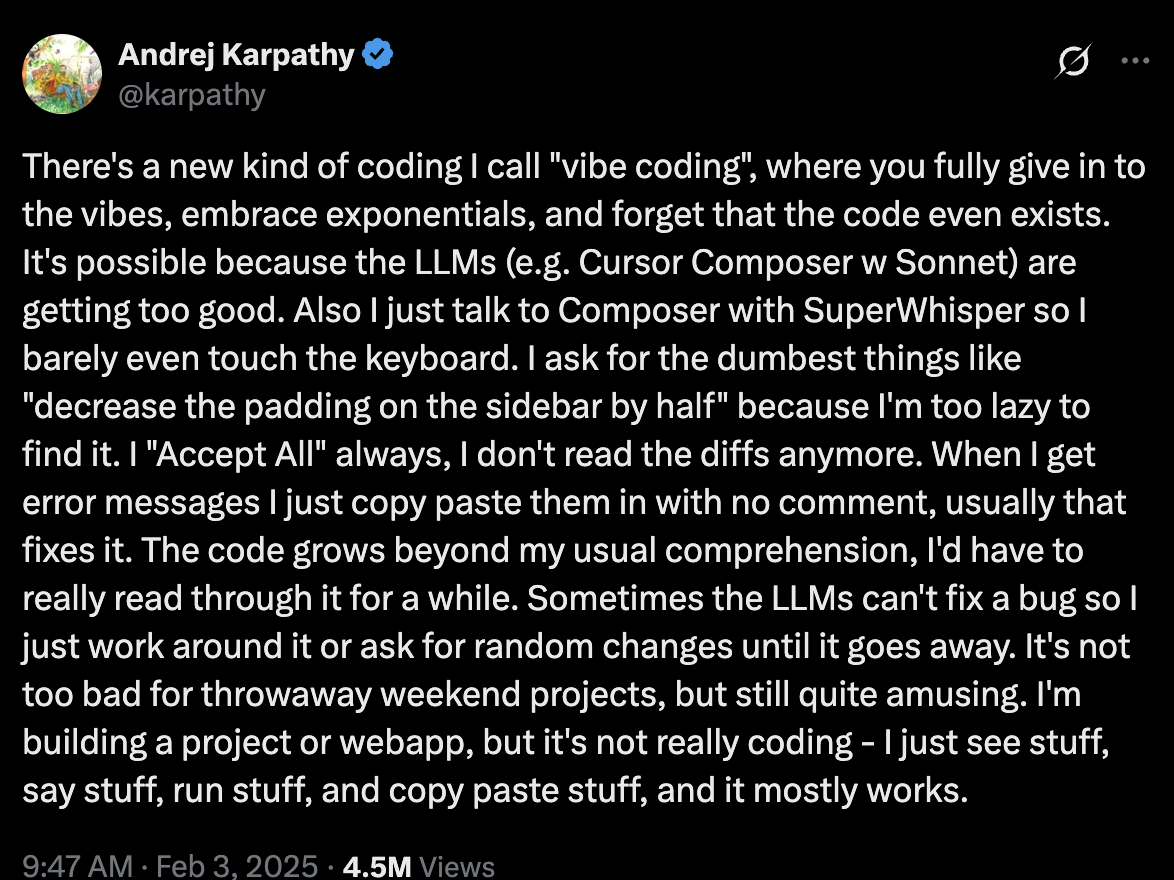 One early answer in software is vibe coding — a term introduced by Andrej Karpathy (OpenAI co-founder, ex-Tesla AI lead) in February 2025. It captures a shift: coding guided less by rigid structure, more by feel, flow, and co-creation with AI.