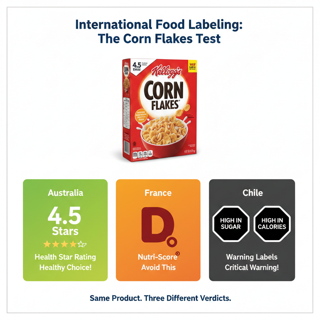 Let's run a thought experiment. Take that same box of cornflakes to France. Their Nutri-Score system rates it "D" — second-worst category (only "E" is worse).