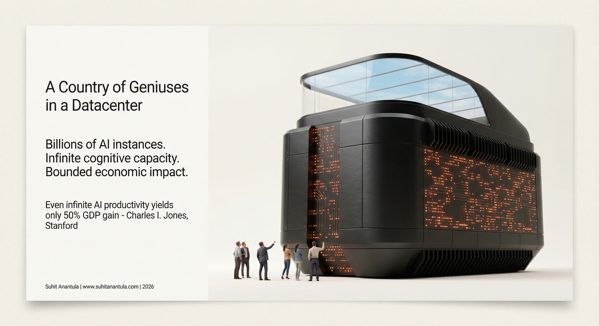 Why? Because the hard-to-automate tasks — the Loops and Vibes — constrain the whole system. The country of geniuses in the datacenter is infinitely productive at some tasks and completely useless at others.