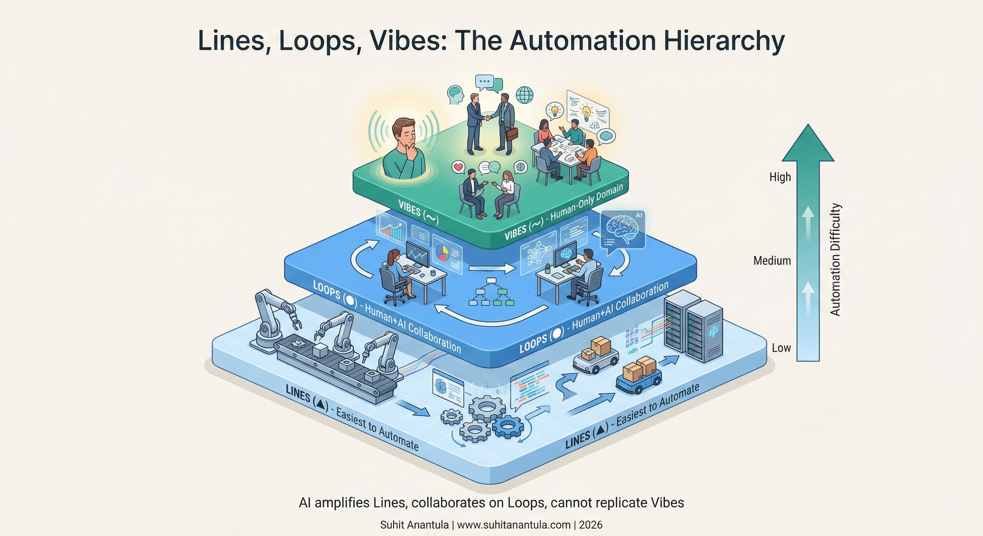Lines, Loops, and Vibes aren't just organisational rhythms. They're also a hierarchy of automation difficulty.