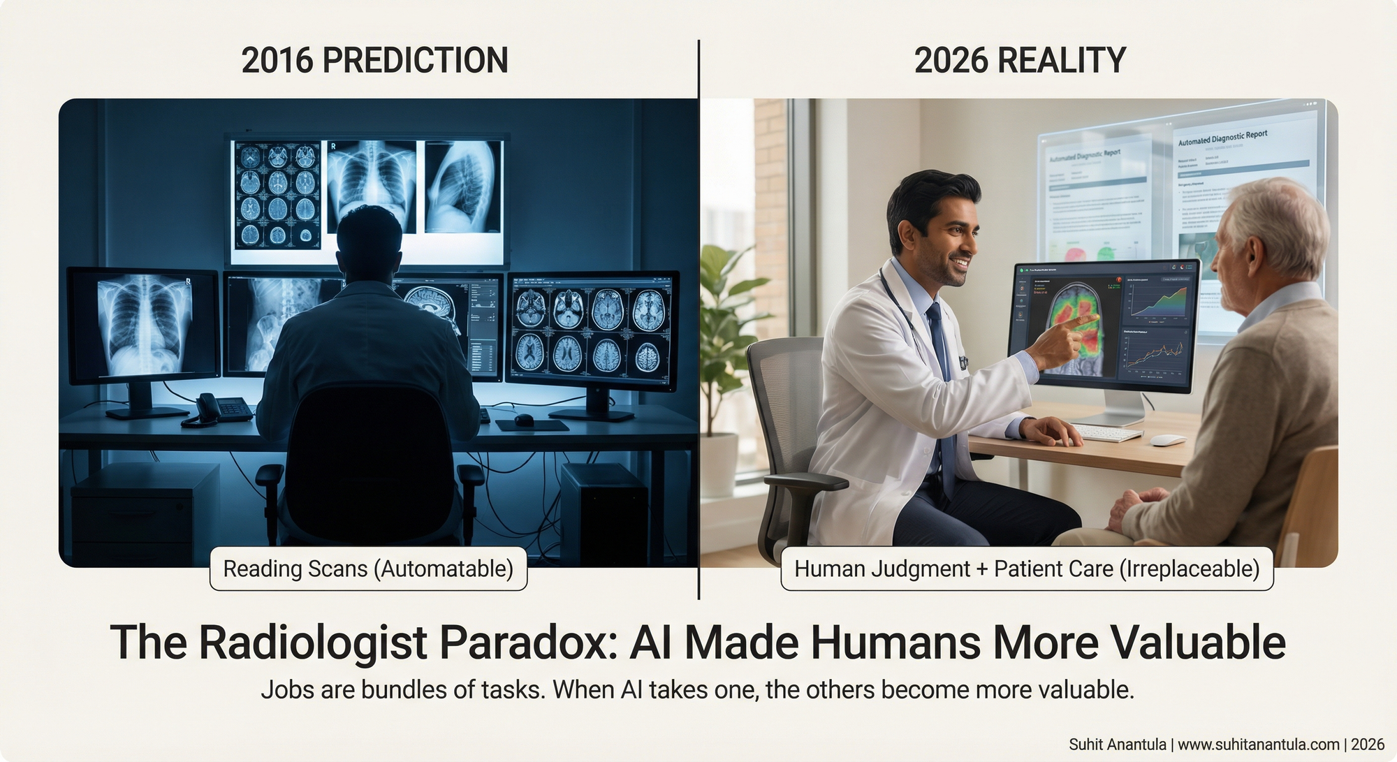 The radiologists didn't disappear because their jobs were bundles of tasks. AI took one task. The others remained — and became more valuable.